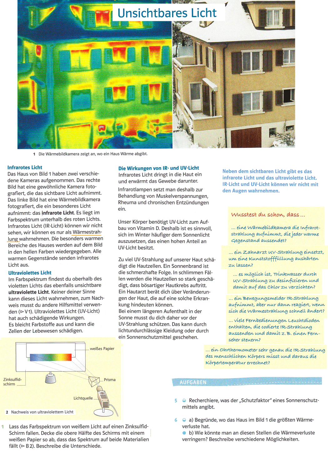 Das folgende Blatt ist besonders wichtig: Zum einen gibt es einige Beispiele für die Anwendung von Infrarot- und Ultraviolett-Strahlung im Alltag (bei „Wusstest du schon, dass ...”). Zum anderen erkennt man diese Strahlungsarten nicht durch Sehen, sondern an ihren Wirkungen. Das ist wie beim elektrischen Strom: auch ihn können wir nicht sehen, hören oder schmecken - wohl aber kann man seine Wirkungen wahrnehmen (Licht, Magnetismus, Wärme).