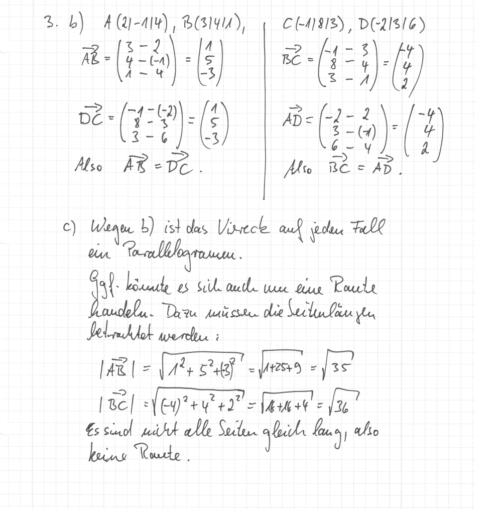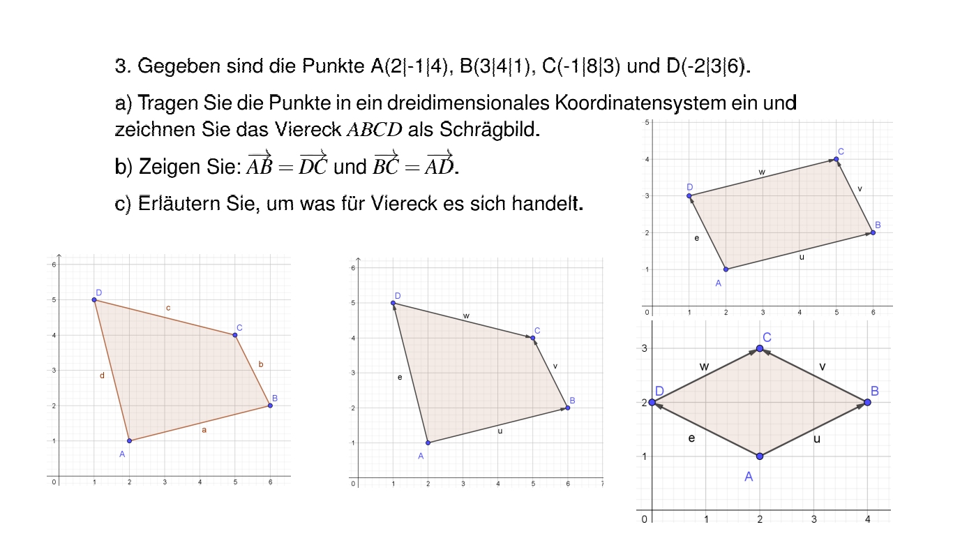b) Das Viereck ABCD ist ein Parallelogramm. Drei Punkte sind bekannt: A(0|3|1), B(6|5|7), C(4|1|3).