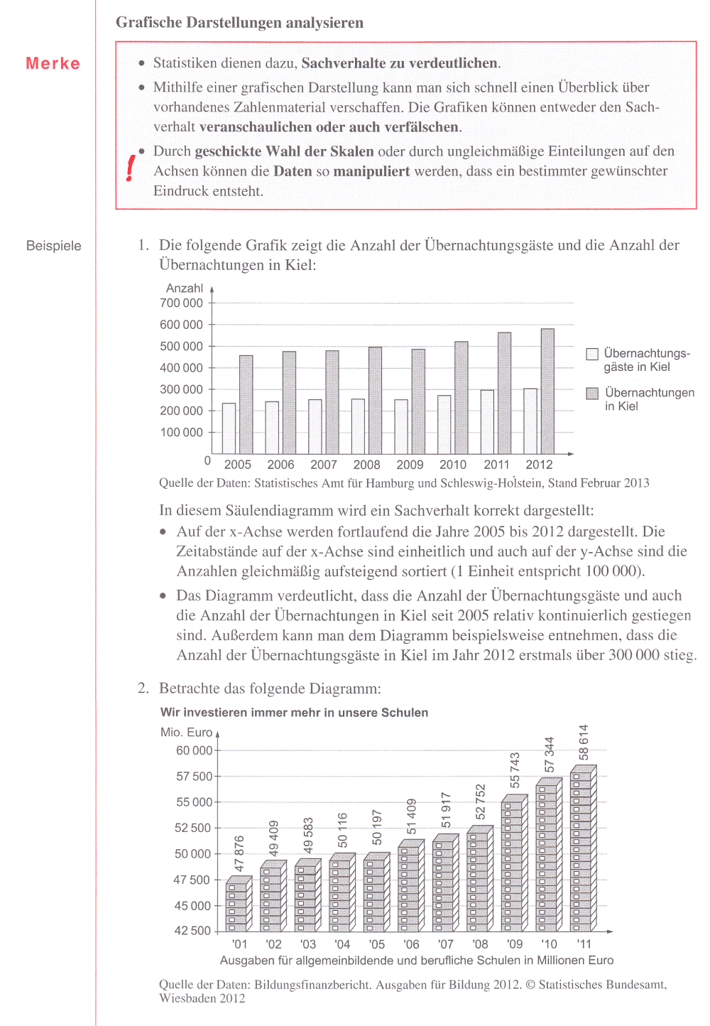 c) Bei der Deutung von Daten gibt es oft Fragen zum Täuschen und Tricksen. Werden also Aufgaben der Art „Beurteile, ob das Diagramm ...” gestellt, dann geht es meistens darum, ob die Darstellung angemessen ist oder ob derjenige, der das Diagramm erstellt hat, in irgendeiner Form etwas verzerren oder beschönigen möchte, also den Betrachter täuschen möchte.