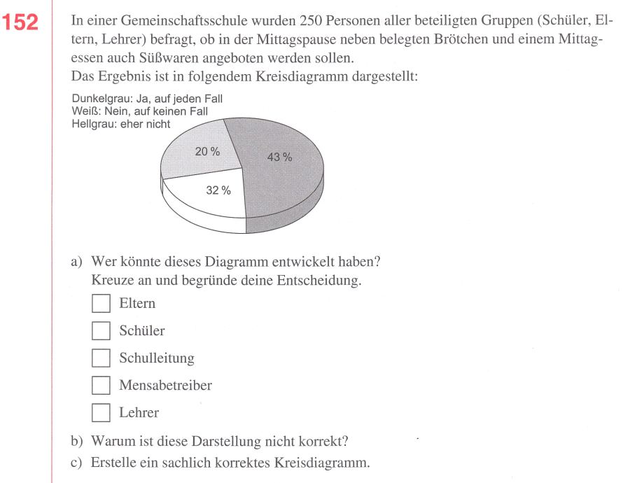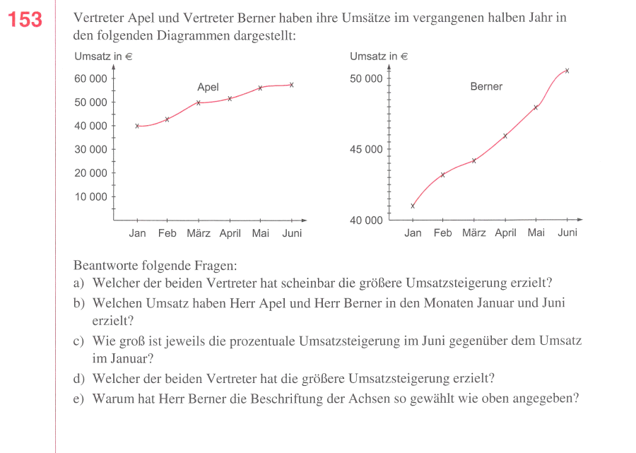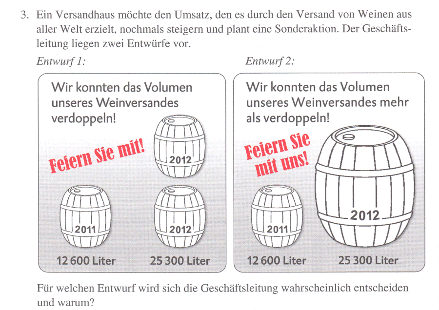 Das 2. Beispiel ist in diesem Sinne ein schönes Beispiel. Leider werden in den Aufgaben selten so deutliche Fragen gestellt wie „c) Warum handelt es sich um eine verfälschte Darstellung?”