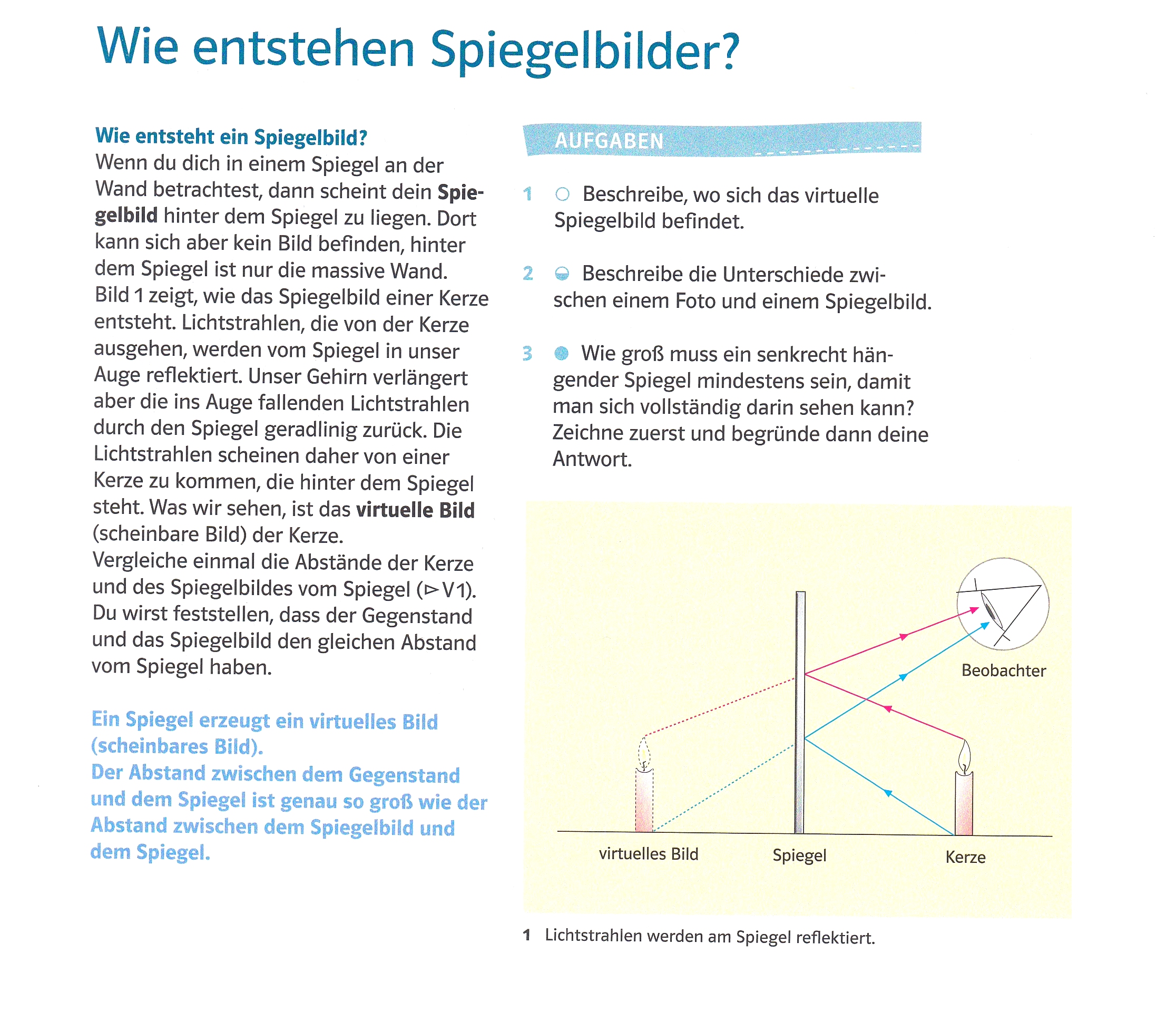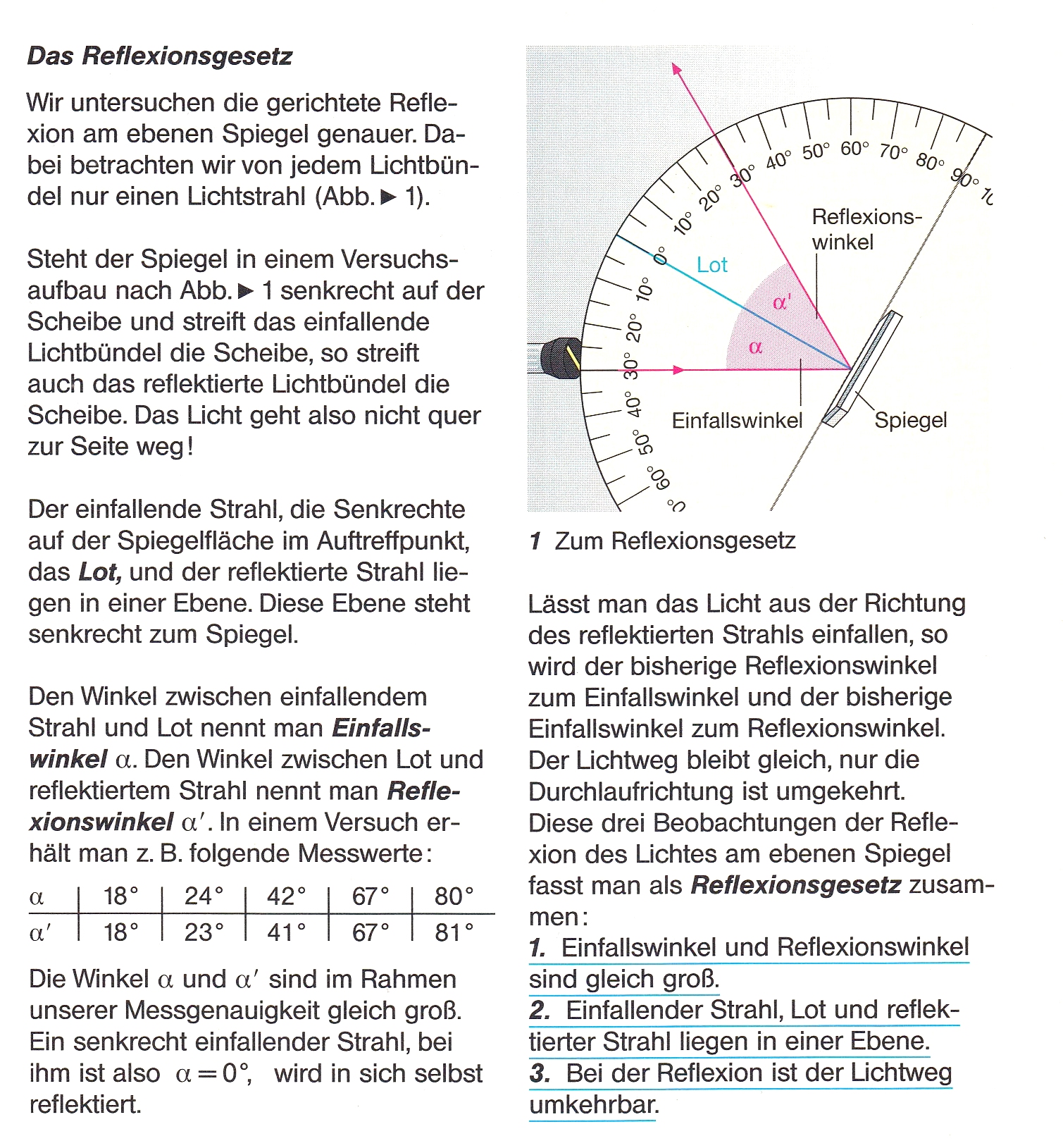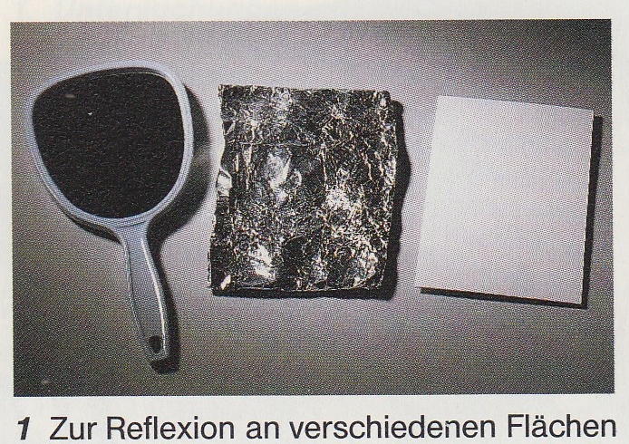 Lichtstrahlen werden von Oberflächen zum Teil aufgenommen (absorbiert) und zum Teil reflektiert. Wird z. B. ein weißer Körper mit Licht bestrahlt, reflektiert er das gesamte Licht. Ein schwarzer Körper reflektiert praktisch kein Licht sondern absorbiert alles. Durch das reflektierte Licht können wir Gegenstände also erst sehen. Zunächst betrachten wir die Reflexion bei Spiegeln