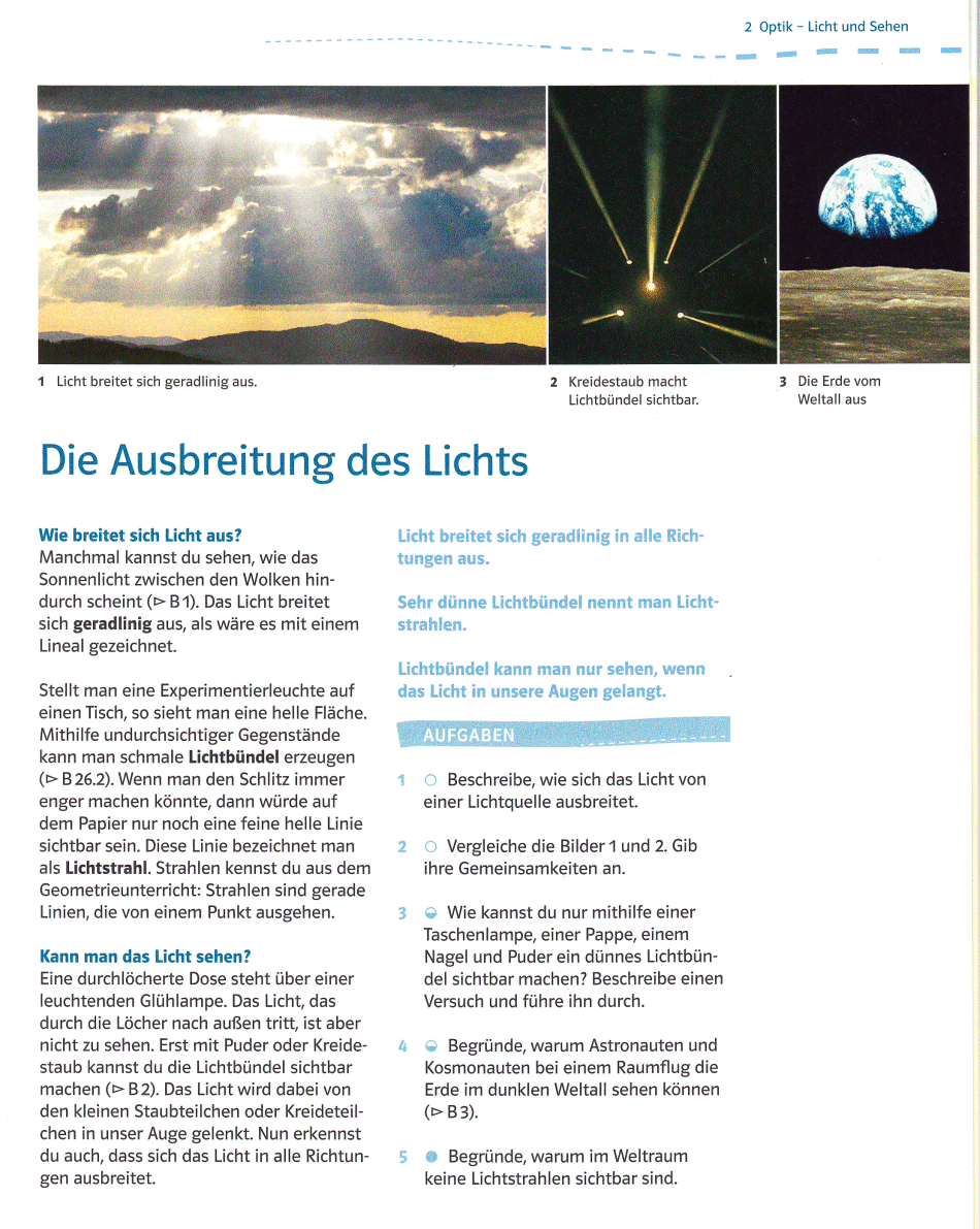 Optik, die Lehre vom Licht. Wichtig ist die geradlinige Ausbreitung von Licht; Licht kann daher als Bündel von Lichtstrahlen betrachtet werden.