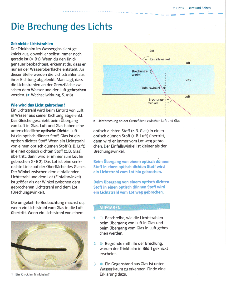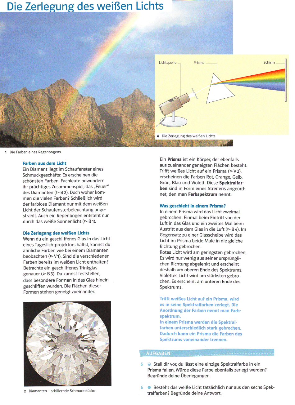 Lichtstrahlen werden an Grenzschichten zwischen zwei Stoffen gebrochen, wenn diese durchscheinend sind, also Luft, Wasser, Glas, Diamant u. ä. Lichtbrechung ist wichtig für die Bildentstehung bei Linsen. Bricht man weißes Licht an einem Dreiecksprima, so sieht man ein farbiges Spektrum wie beim Regenbogen: Weißes Licht besteht also aus Farben.