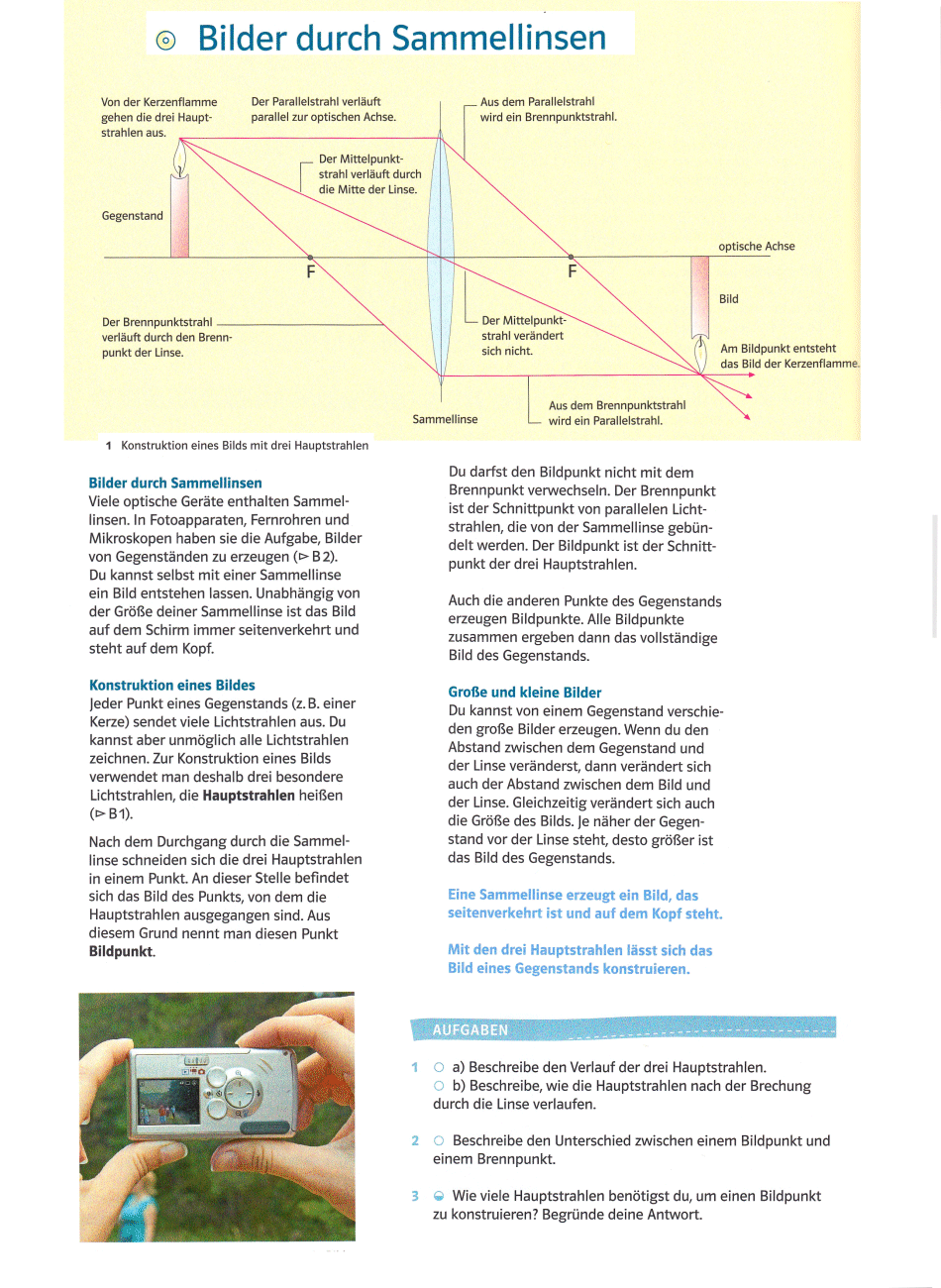 Ein Aspekt aus dem Alltag: Bringt man einen Körper dicht an eine Sammellinse, genauer zwischen Linse und ihren Brennpunkt, dann ist die Sammellinse eine Lupe. Bei der Lupe ist das Bild aber nicht seitenverkehrt und steht auch nicht auf dem Kopf, wie es im Text erklärt wird, sondern das Bild ist seitengerecht und steht aufrecht.