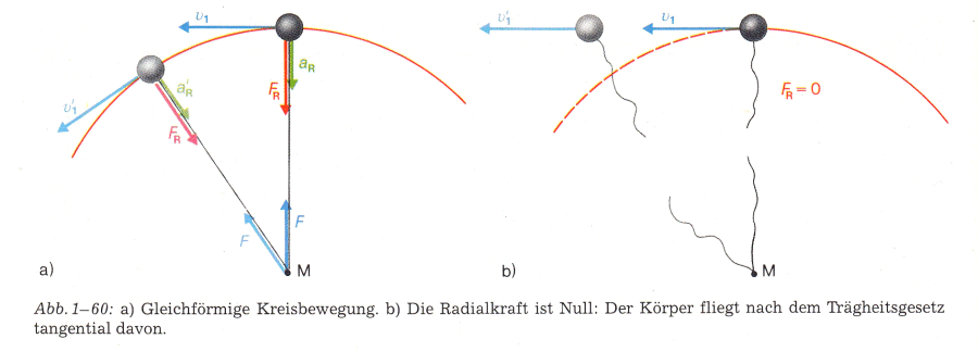 Was passiert, wenn die Kraft, die einen Körper auf die Kreisbahn zwingt (die Radialkraft oder Zentripetalkraft), plötzlich ausfällt (z. B. in einer vereisten Straßenkurve), zeigt folgende Abbildung: